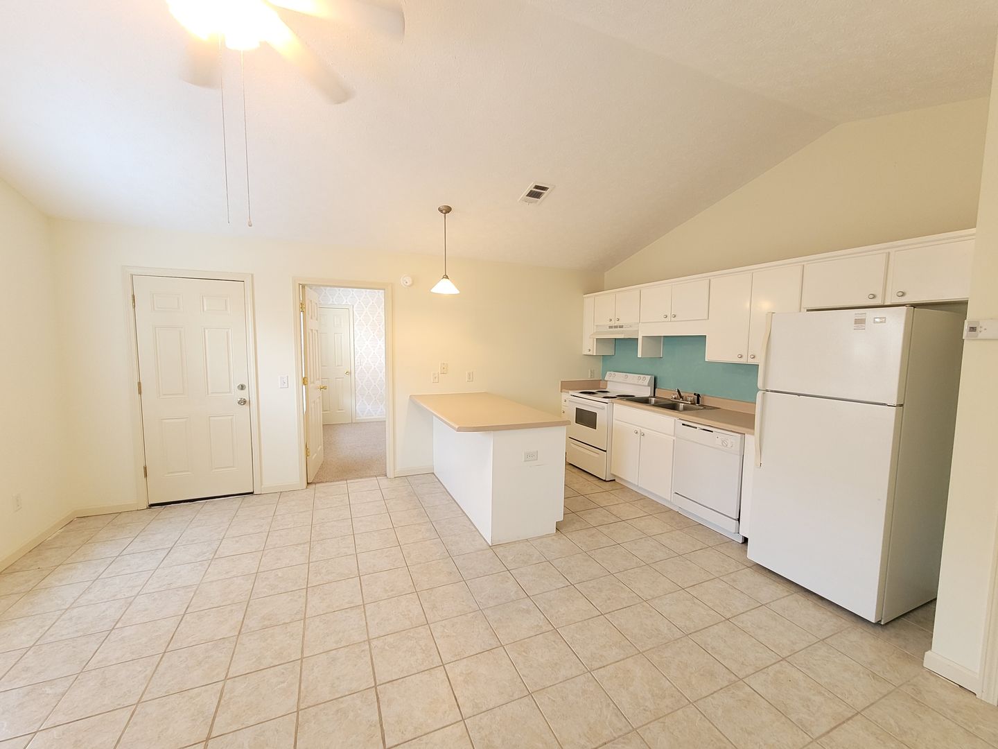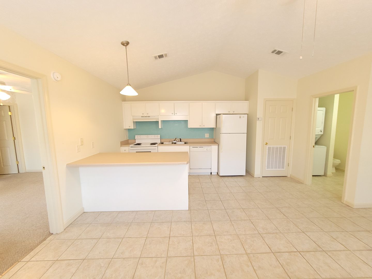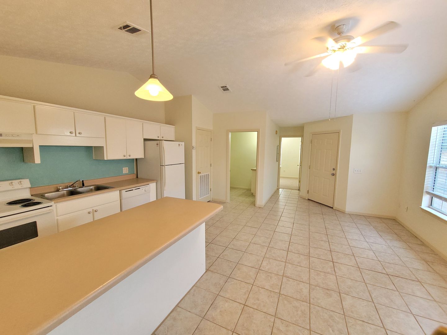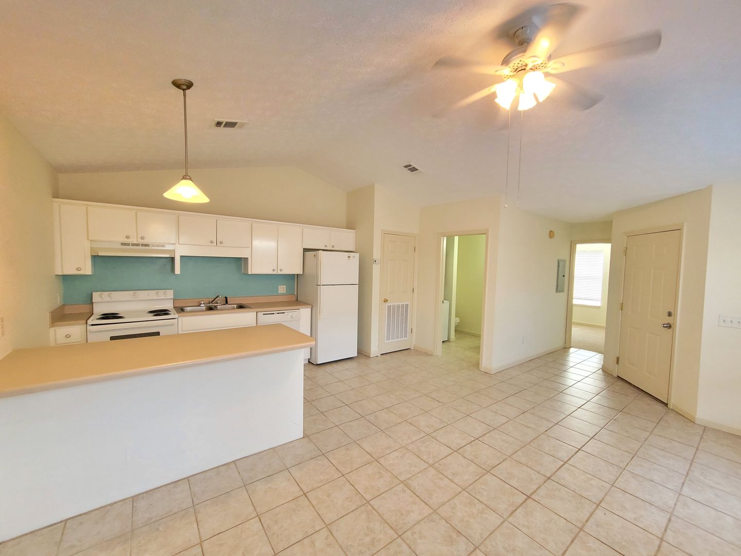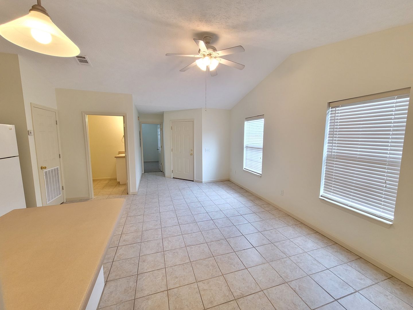 1 master bedroom, bonus room/office, 1.5 bath, open living area with vaulted ceiling open to the kitchen, breakfast bar, stackable W/D included AS IS, tile flooring in the common areas and berber carpet in the bedrooms, covered front porch and open back patio.
