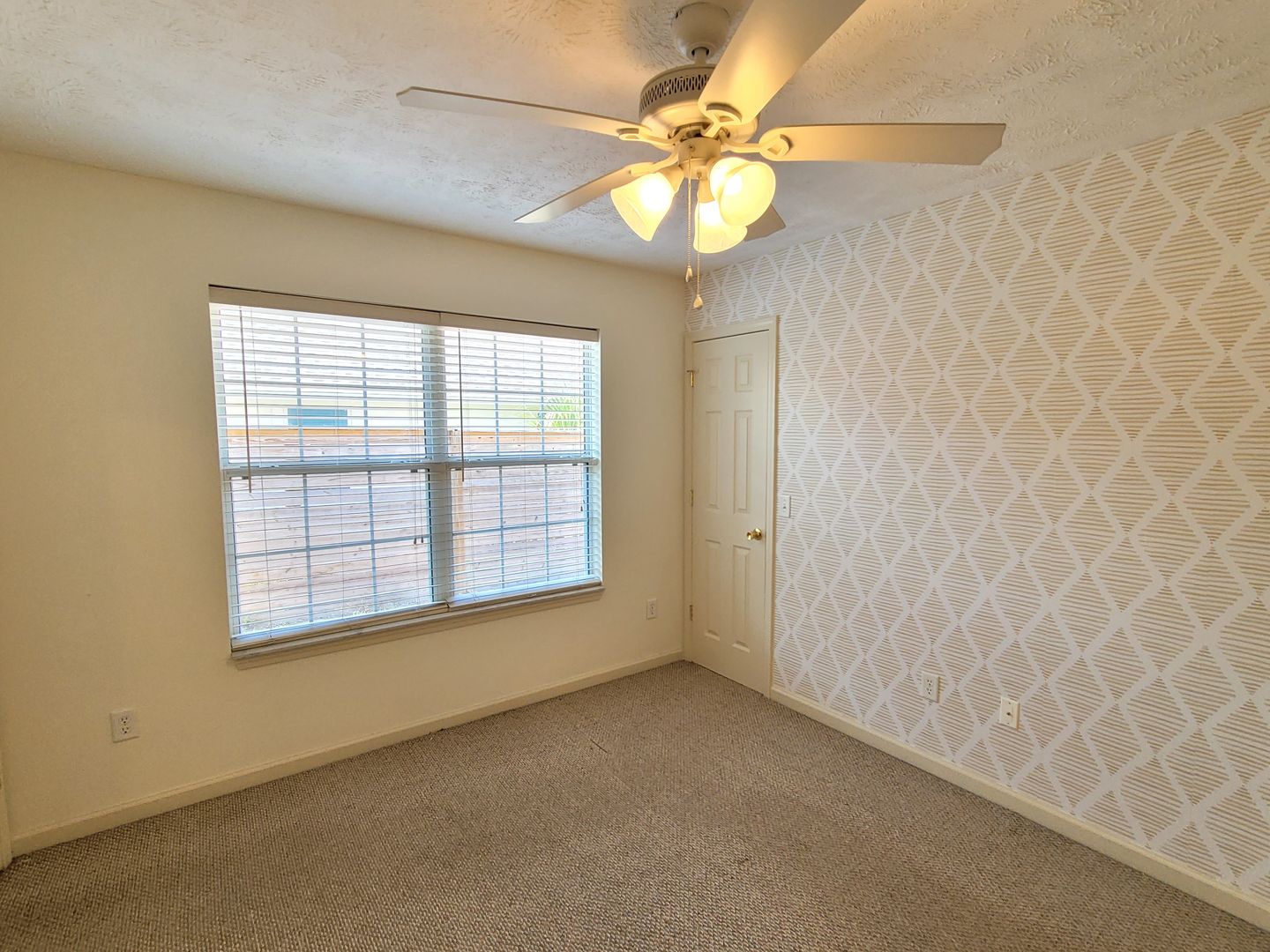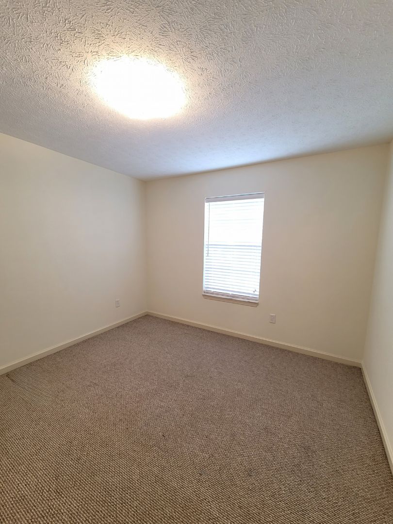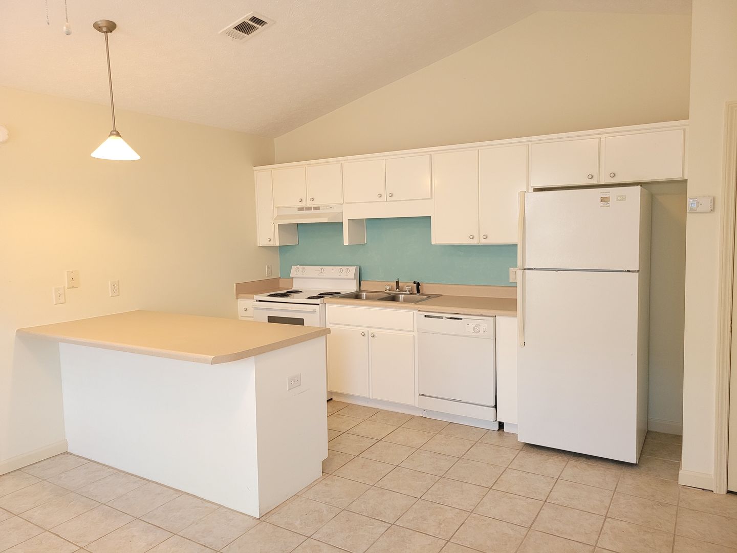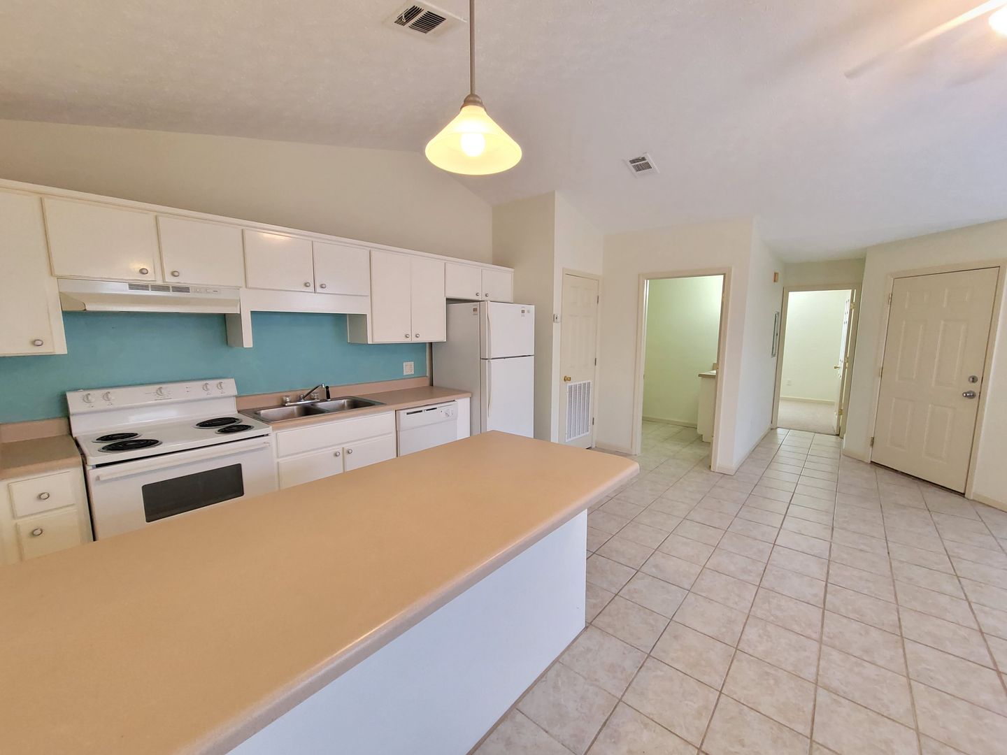 1 master bedroom, bonus room/office, 1.5 bath, open living area with vaulted ceiling open to the kitchen, breakfast bar, stackable W/D included AS IS, tile flooring in the common areas and berber carpet in the bedrooms, covered front porch and open back patio.